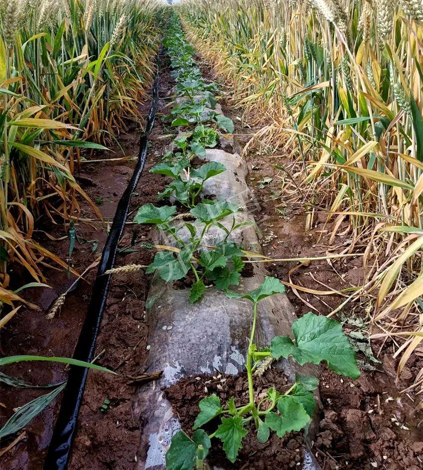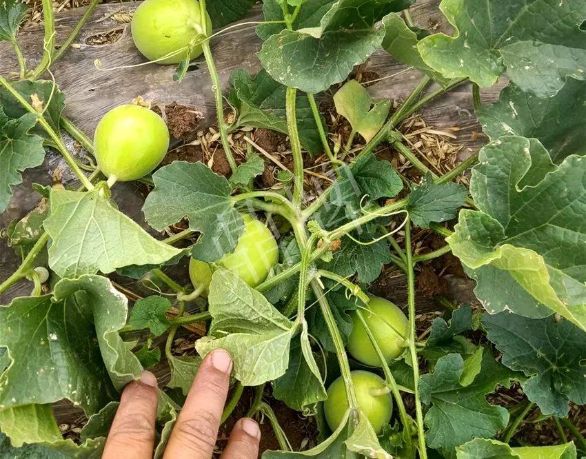 我們這里是從四月中旬開始麥茬套種甜瓜,為了讓甜瓜盡早上市,賣上好價錢,就在麥子收獲前定植。行距為1.9米、株距1米,甜瓜苗在未成熟的麥田中生長,寬行距有利于通風(fēng),以利瓜苗快速生長。